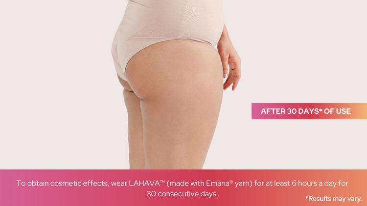 Usage Guide: To obtain the cosmetic effect, wear LAHAVA™ shapewear (made with Emana® yarn) for 6 hours a day over 30 consecutive days.